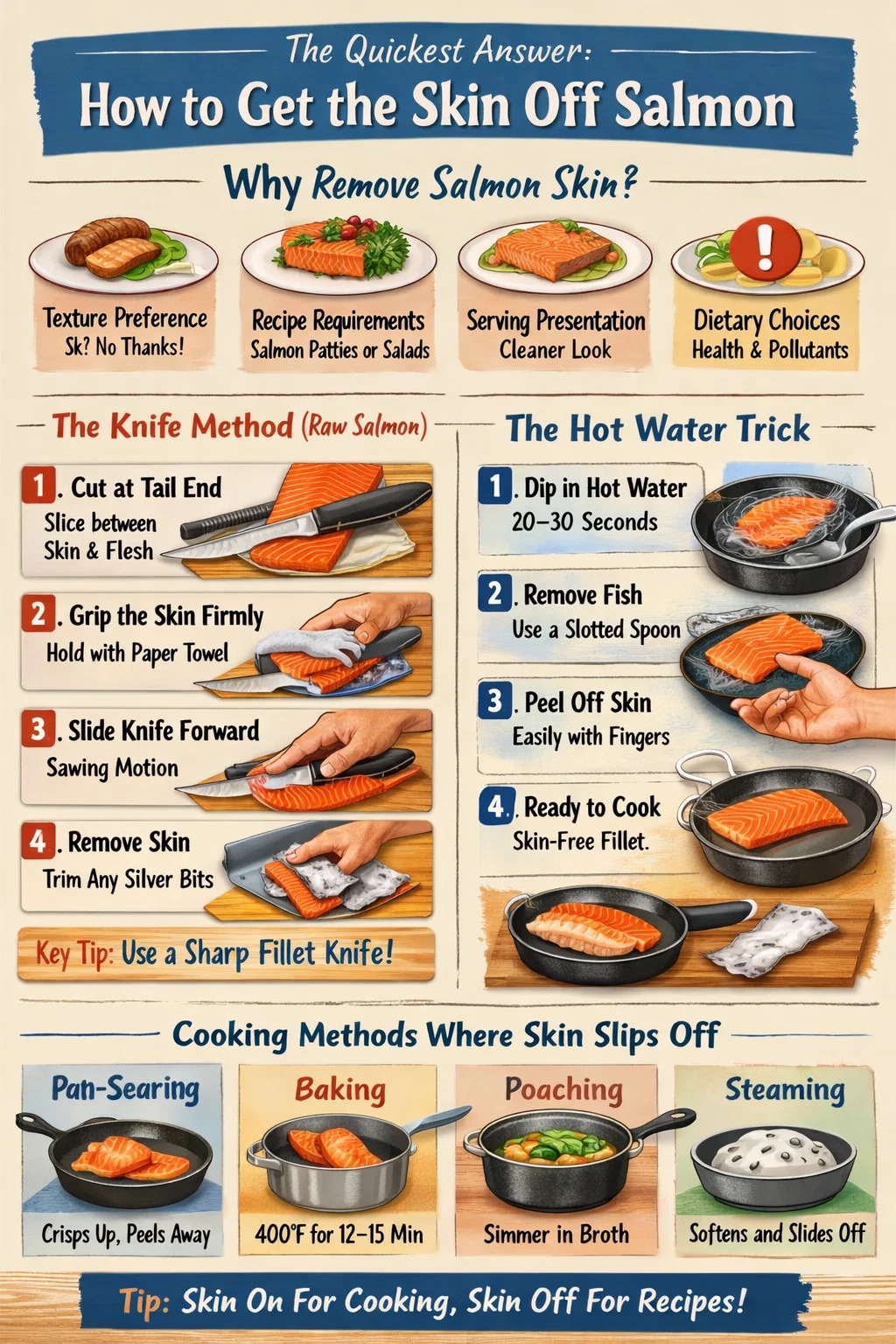 Sinasaklaw ng gabay na ito ang bawat praktikal na diskarte, kabilang ang pamamaraan ng kutsilyo, mga panlilinlang sa tubig na kumukulo, mga paraan ng pagluluto na nagpapadulas kaagad sa balat, at kung paano tama kaldero at kawali maaaring alisin ang pangangailangan sa balat ng salmon sa lahat bago lutuin.