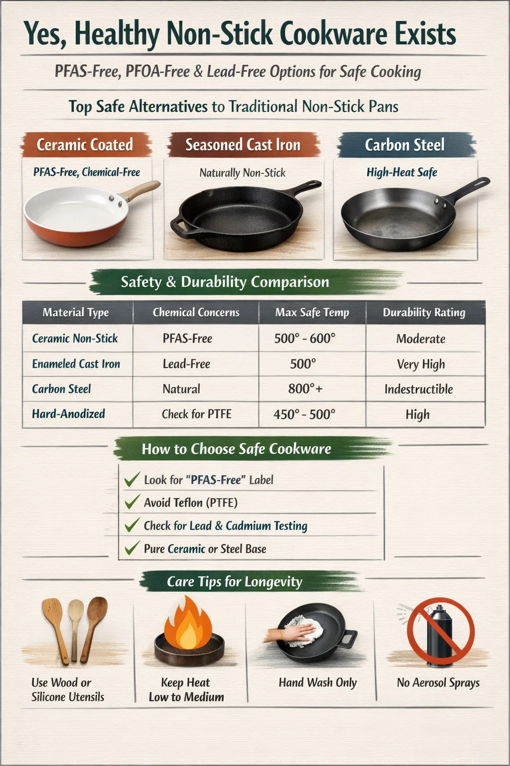 Upang matulungan kang magpasya kung aling malusog non-stick cookware umaangkop sa iyong kusina, sumangguni sa data ng pagganap at kaligtasan sa ibaba.