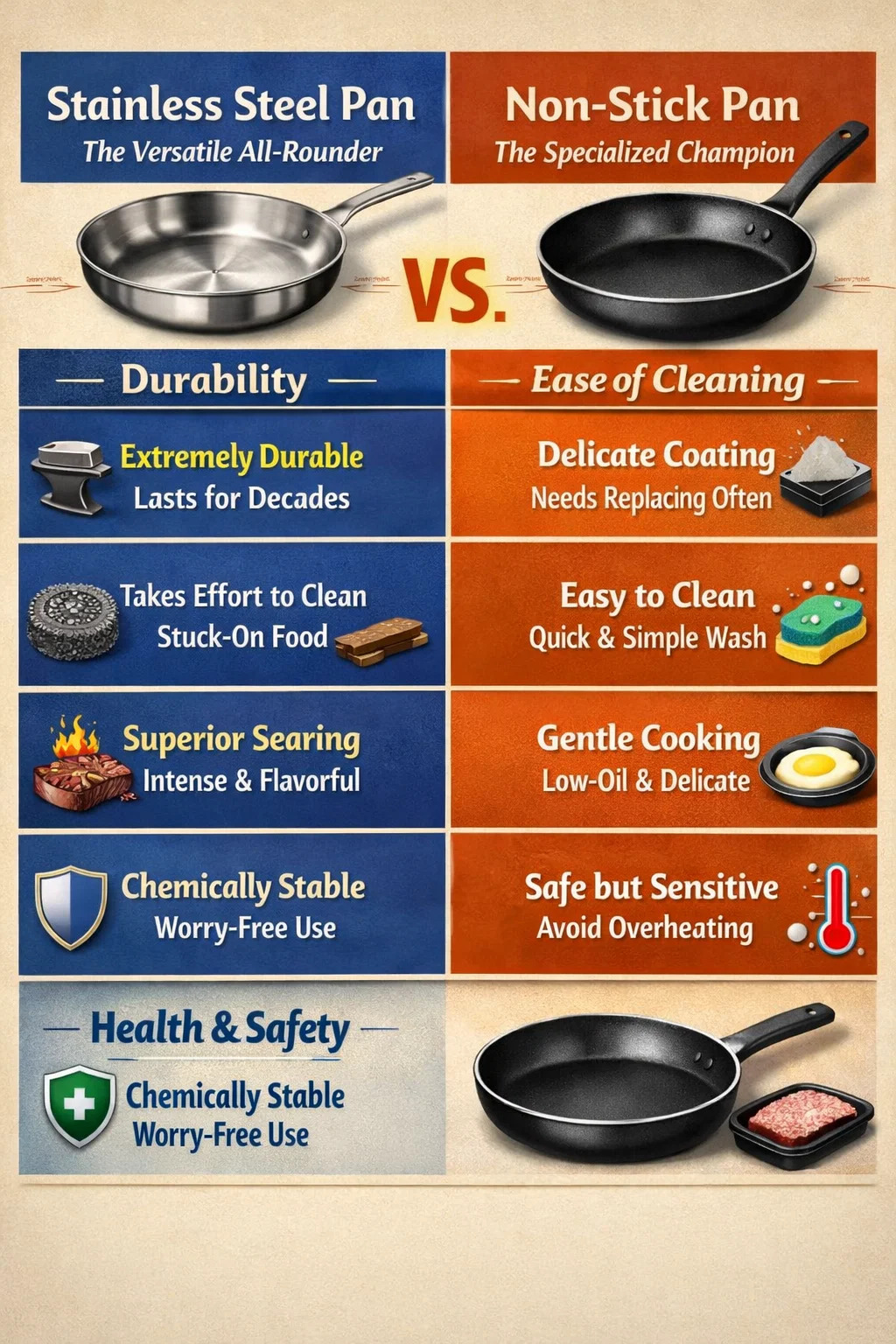Kapag pumipili ng cookware, ang hindi kinakalawang na asero at non-stick na kawali ay may kanya-kanyang pakinabang. Ang mga ito ay hindi isang kaso ng isa na pinapalitan ang isa, ngunit sa halip ay isang "versatile all-rounder" at isang "specialized champion" sa kusina.