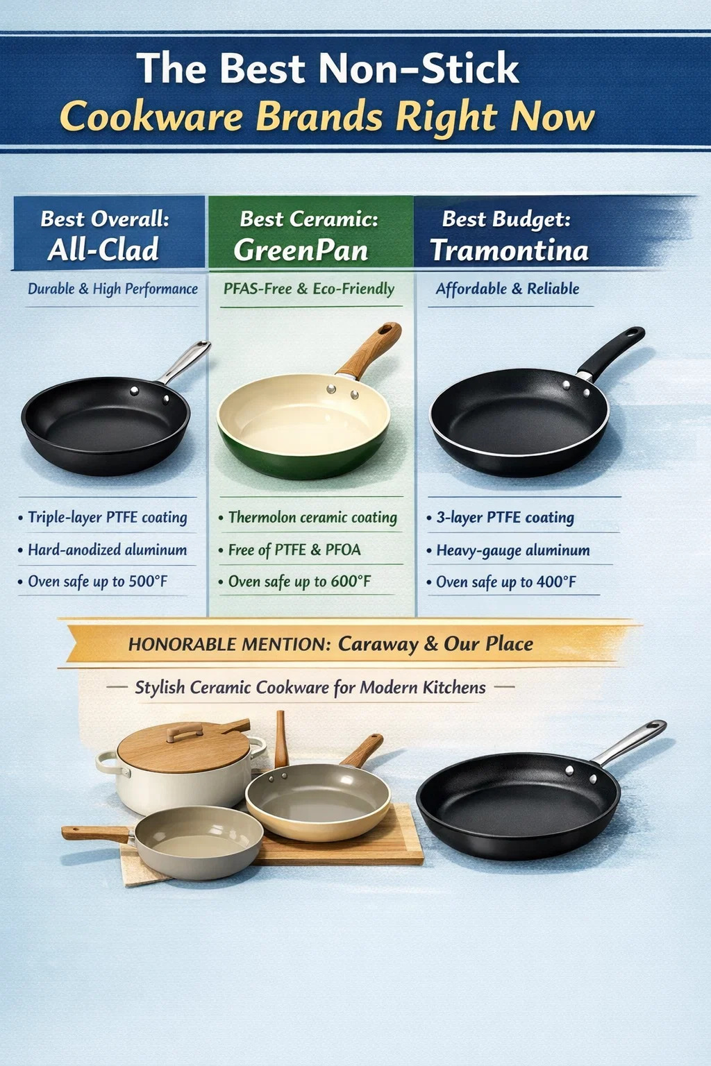 Kung gusto mo ng tuwid na sagot: Ang All-Clad, Zwilling, at GreenPan ay patuloy na niraranggo bilang ang nangungunang non-stick na mga tatak ng cookware sa mga propesyonal na pagsusuri, mga komunidad ng tagapagluto sa bahay, at mga independiyenteng pagsusuri sa lab. Nangunguna ang All-Clad para sa tibay at performance, ang Zwilling (kasama ang Demeyere line nito) ay nangunguna sa mga seryosong lutuin, at ang GreenPan ay nangunguna sa ceramic non-stick na segment para sa mga umiiwas sa PTFE-based coatings.