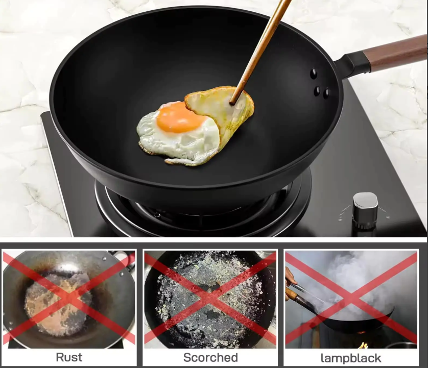 Mga tradisyunal na pan ng bakal: Ang ibabaw ay magaspang, at ang grasa ay kailangang punan ang mga pores upang maiwasan ang pagdikit, kaya kinakailangan ang mas maraming langis.